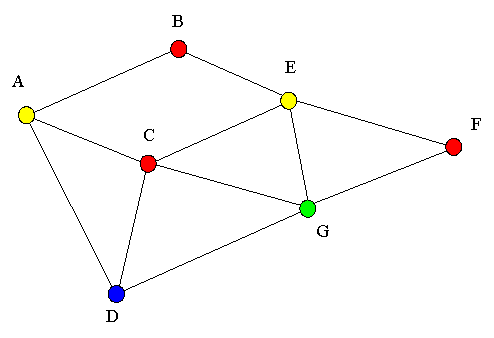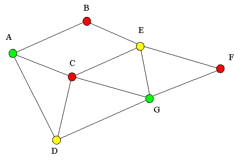 Finalement, on parvient à colorier les deux sommets restants, B et F, de la même couleur que le sommet C. On obtient donc :